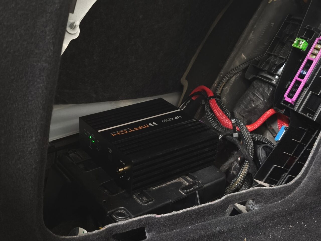 Wzmacniacz z wbudowanym procesorem DSP został zamontowany w fabrycznej lokalizacji, bez utraty przestrzeni i bez zmian wizualnych. Instalacja jest w pełni odwracalna i bezpieczna dla elektroniki pojazdu.